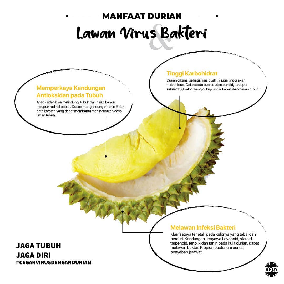 Ada kabar baik nih, dibalik kelezatan buah durian yang disebut sebagai rajanya para buah ternyata durian mempunyai manfaat yang luar biasa. Pada masa pandemi seperti ini, durian mampu melindungi tubuh dari virus & bakteri dan juga mampu menjaga serta meningkatkan daya tahan tubuh. Jadi tunggu apa lagi, yuk di order available juga untuk via gofood dan grabfood 😊